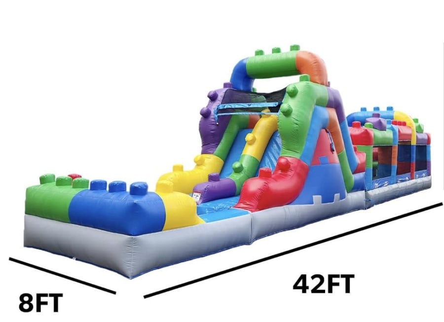 The Block Party wet/dry is a LEGO themed obstacle course designed to tire out kids and young teens. It blends dry challenges with splash-ready fun. We drop off on Friday, set it up for you, and pick it up on Monday. Perfect for weekend parties, school events, and backyard play. 💦🤸♂️